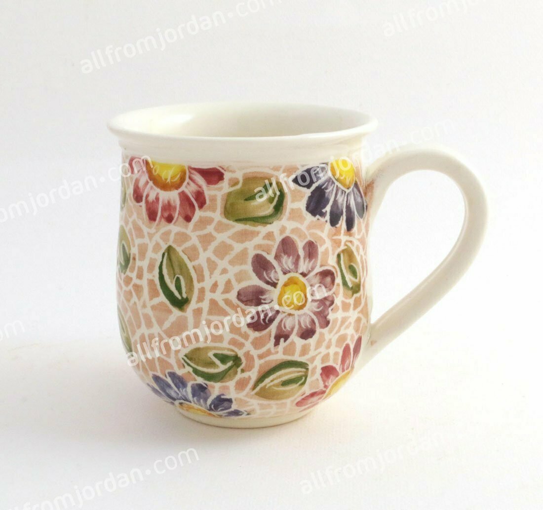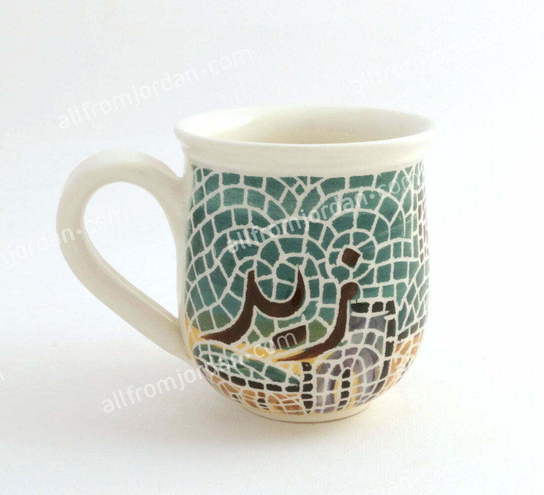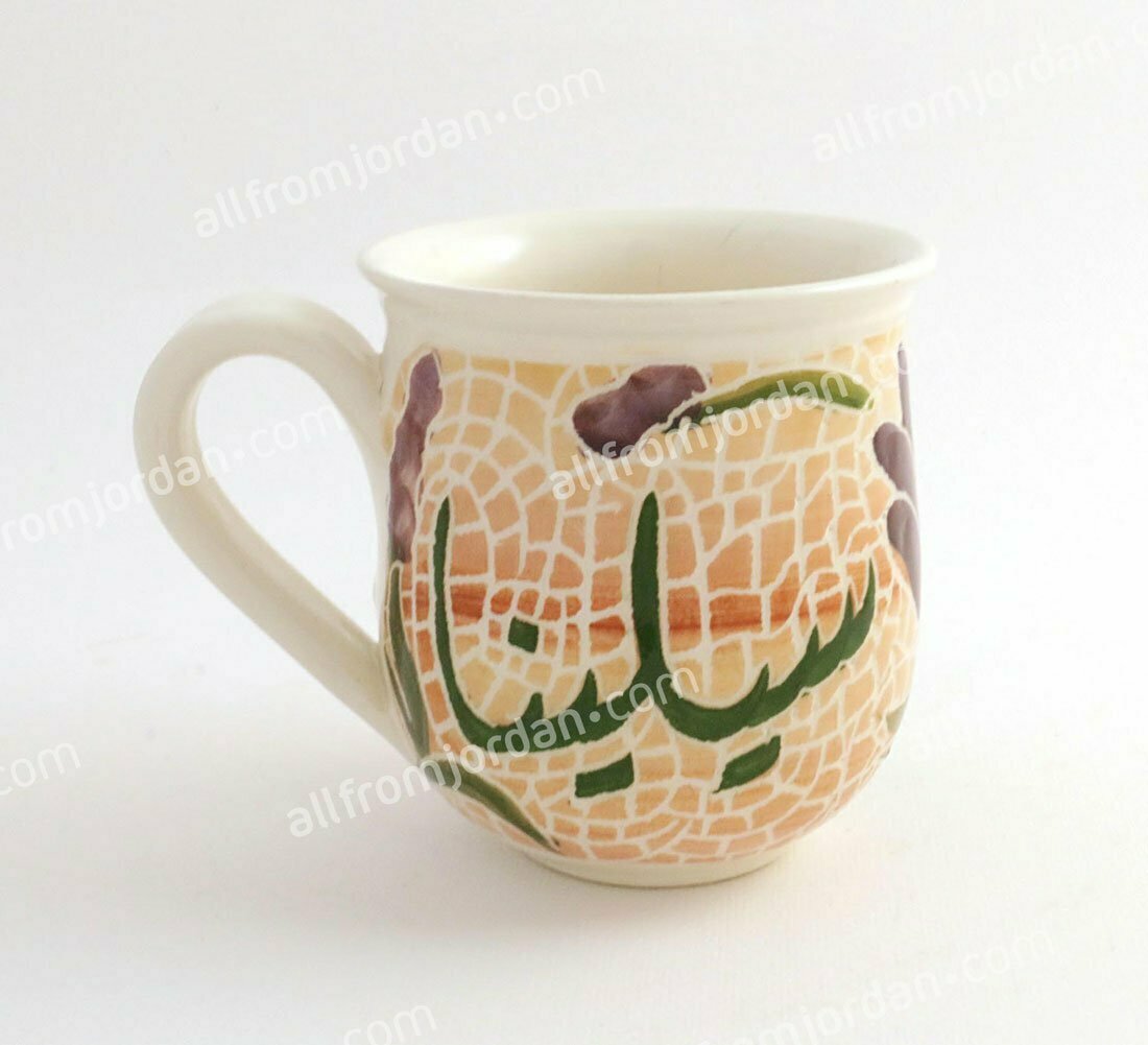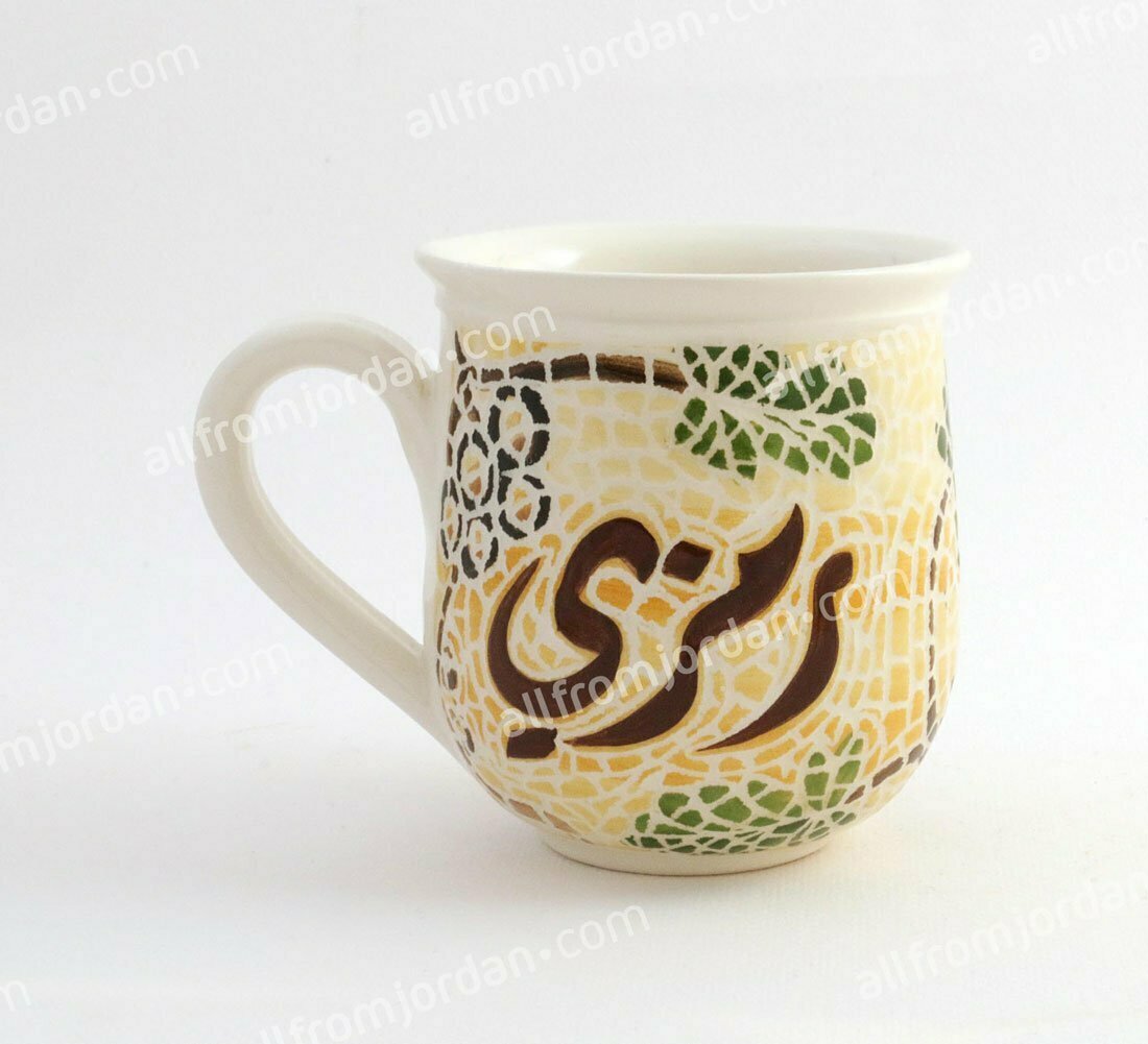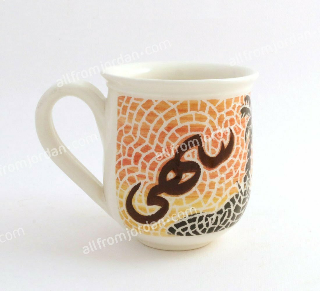 Write your name on a Jordanian mug! Handmade and hand painted with a variety of themes. Available in either white or red clay base.  You can have your name written in Arabic or in Latin lettering. English names can be written in either Arabic or English (latin) letters as per your preference. Arabic names will be written in Arabic unless text field is written in English. Spelling will be exactly as submitted.