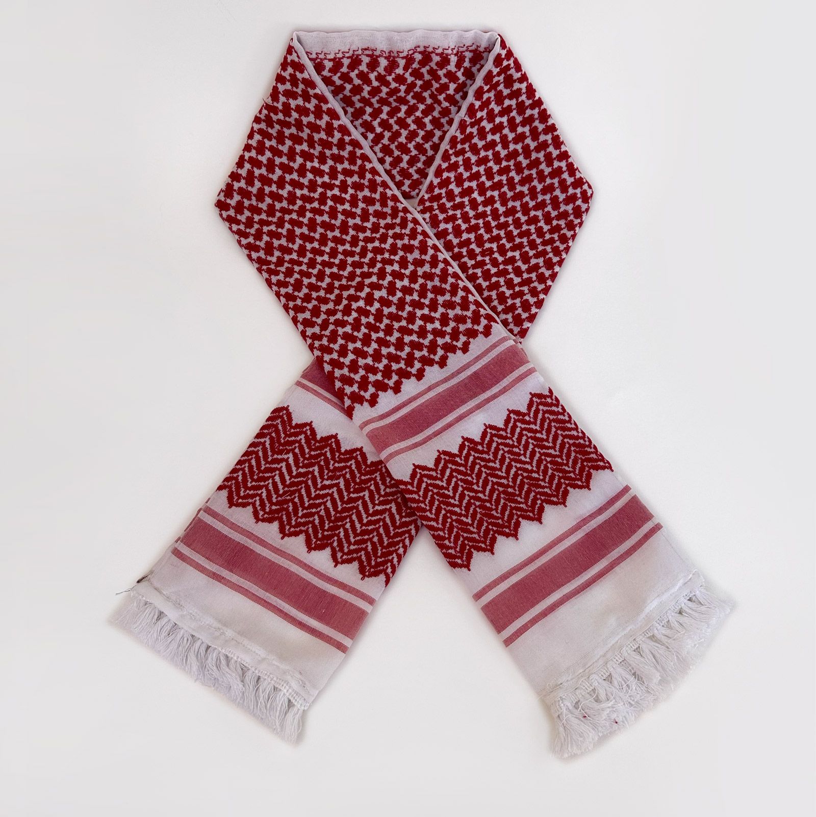 Red and White Keffiyeh Scarf with handmade hadab (tassels) at the ends.