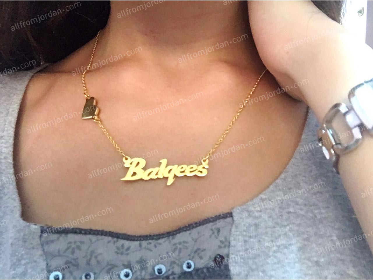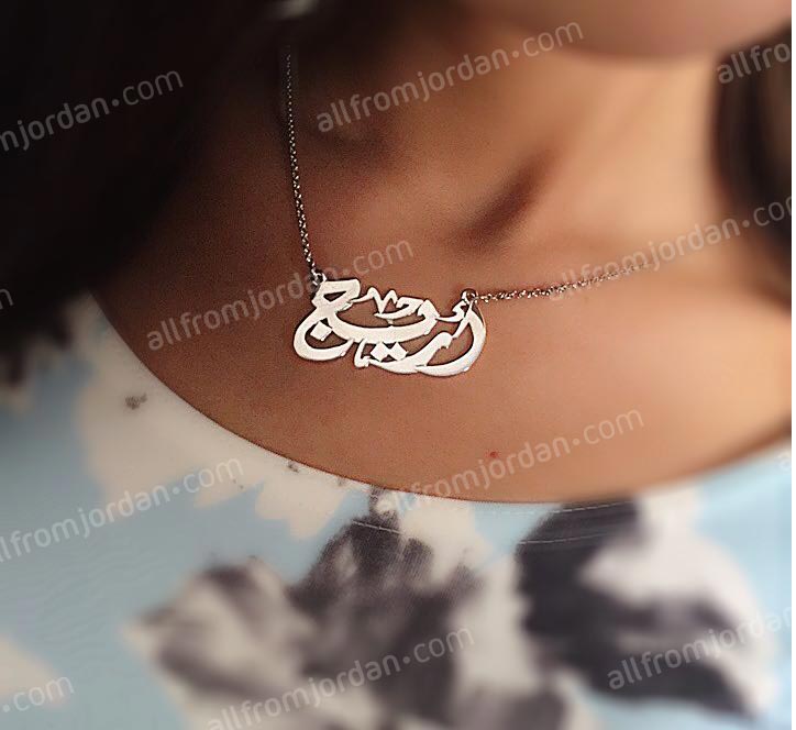 Perfect gift for her. Gold or silver plated necklace with custom made name in Arabic or English. Please specify the name you wish to have written and language. Allow 10-14 days to produce and ship. Comes in gold plated or silver plated (rhodium plated). Handmade in Jordan. Free shipping worldwide.