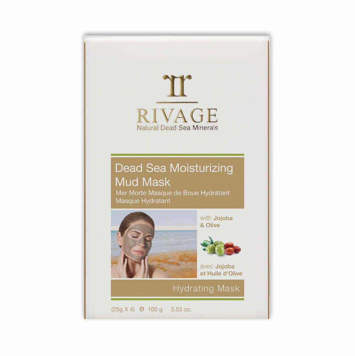 Dead Sea Facial Moisturizing Mud Mask rich with Jojoba & Olive oil. A moisturizing Dead Sea mud mask that regenerates your skin and provides an ultimate skin hydration. Rivage Moisturizing mud mask is enriched with a unique blend of natural Dead Sea mud and hydrating plant extracts. Natural Dead Sea mud helps cleanse impurities and exfoliate your skin’s outer layer, while Olive oil helps protect and balances your skin moisture. Jojoba is a natural emollient that hydrates and enhances your skin elasticity. Your skin instantly becomes soft, smooth, and supple.