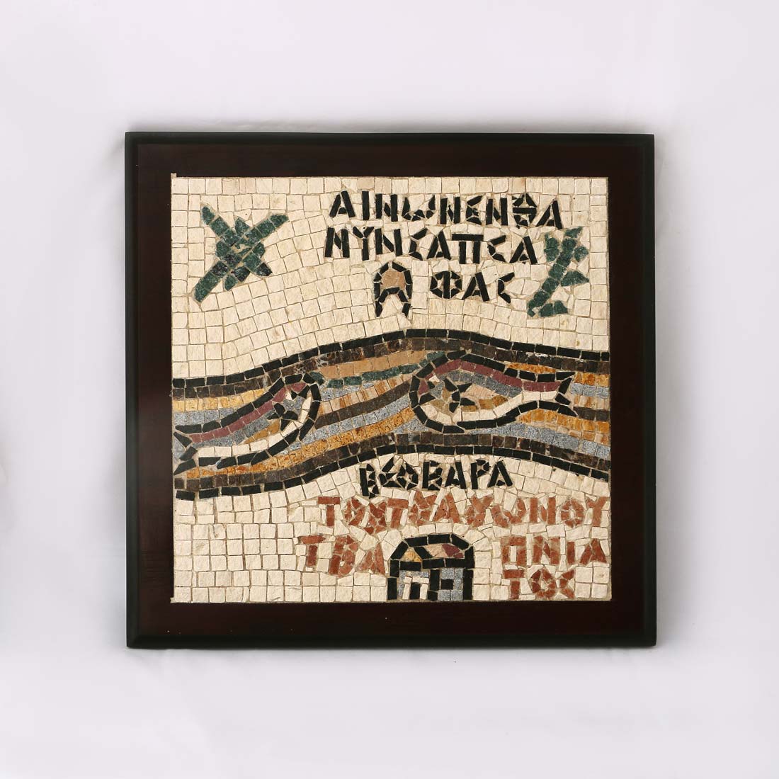 Replica of a segment of the world famous map of 6th century map the Holy Land in St. Goeroge’s Church in Madaba (also known as “Church of the Map”) . This segment depicts Jordan River with fish flowing to the Dead Sea and returning back to the river running away from the fatal high salinity of the Dead Sea. The full original church floor mosaic map can be found More on the Church of the Map (St. George’s Church) here. Framed mosaic hand-made in Madaba, the hub of mosaics making in Jordan from natural stone pieces. Crafted meticulously in the tradition of Jordanian mosaic making handed down from generations. If it is not in stock, it will be made to order (in which case please allow 2-3 weeks for making and delivery).