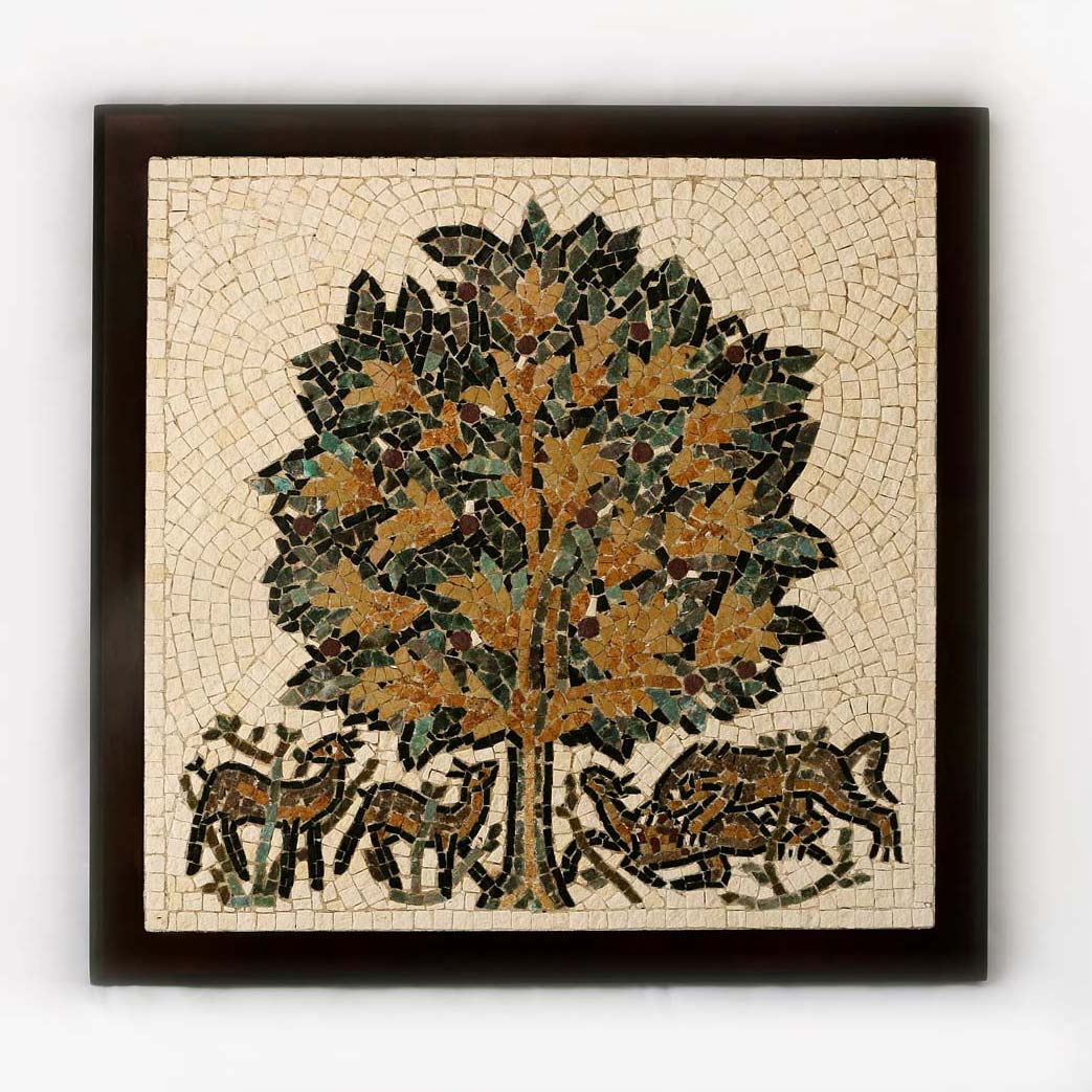 Replica of the famous Jericho Tree of Life in the Holy Land. The original can be found on the floor of the church in Jericho dating back to the Byzantine era. It depicts deer under the tree and a lion attacking one of the deer. Framed mosaic hand-made in Madaba, the hub of mosaics making in Jordan from natural stone pieces. Crafted meticulously in the tradition of Jordanian mosaic making handed down from generations. If it is not in stock, it will be made to order (in which case please allow 2-3 weeks for making and delivery).