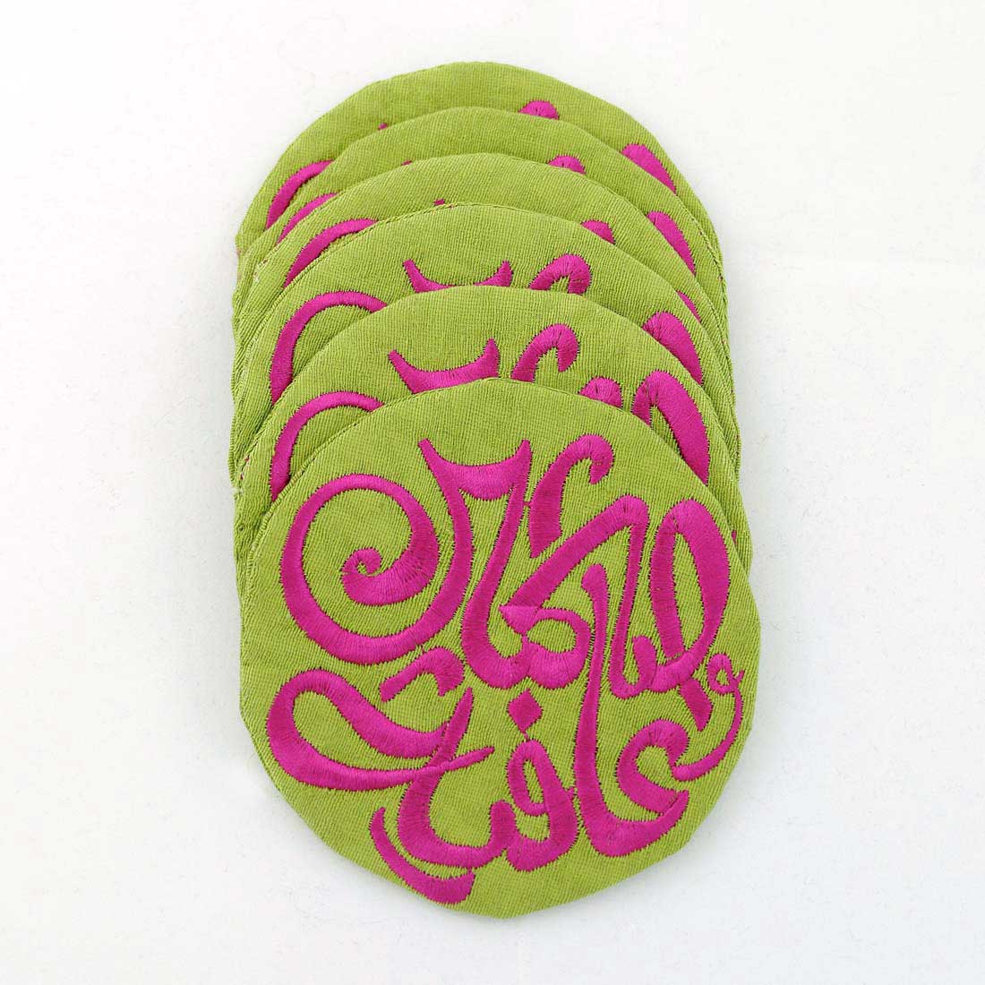 Round coasters embroidered with ” صحتين وعافية ” (Bon Apetit) in Arabic. 4 Pcs set. Choose your favourite colour. Handmade in Jordan.