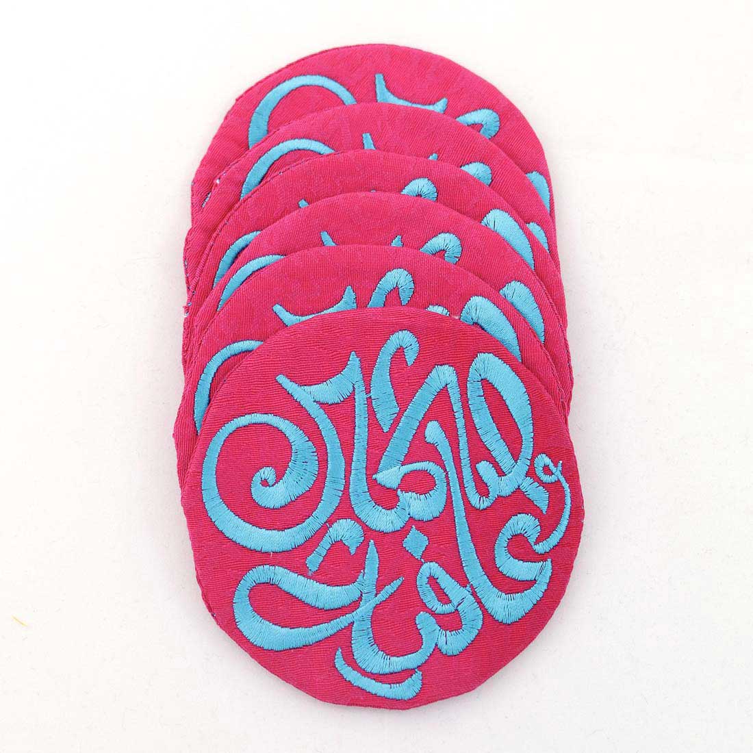 Round coasters embroidered with ” صحتين وعافية ” (Bon Apetit) in Arabic. 4 Pcs set. Choose your favourite colour.