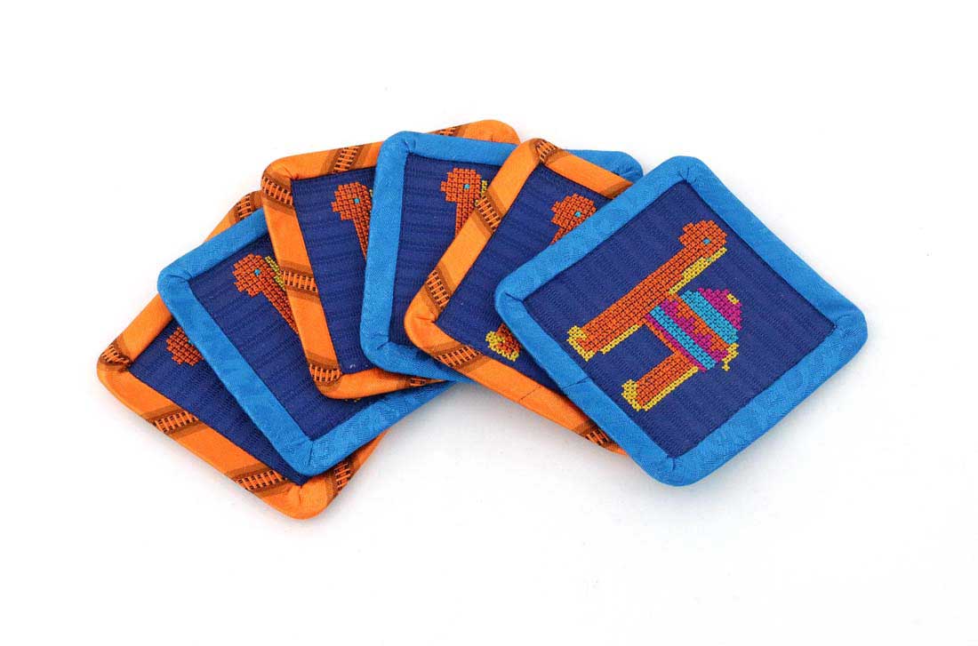 Handmade embroidered square 4 pcs “Camel” design coasters set, blue and orange.