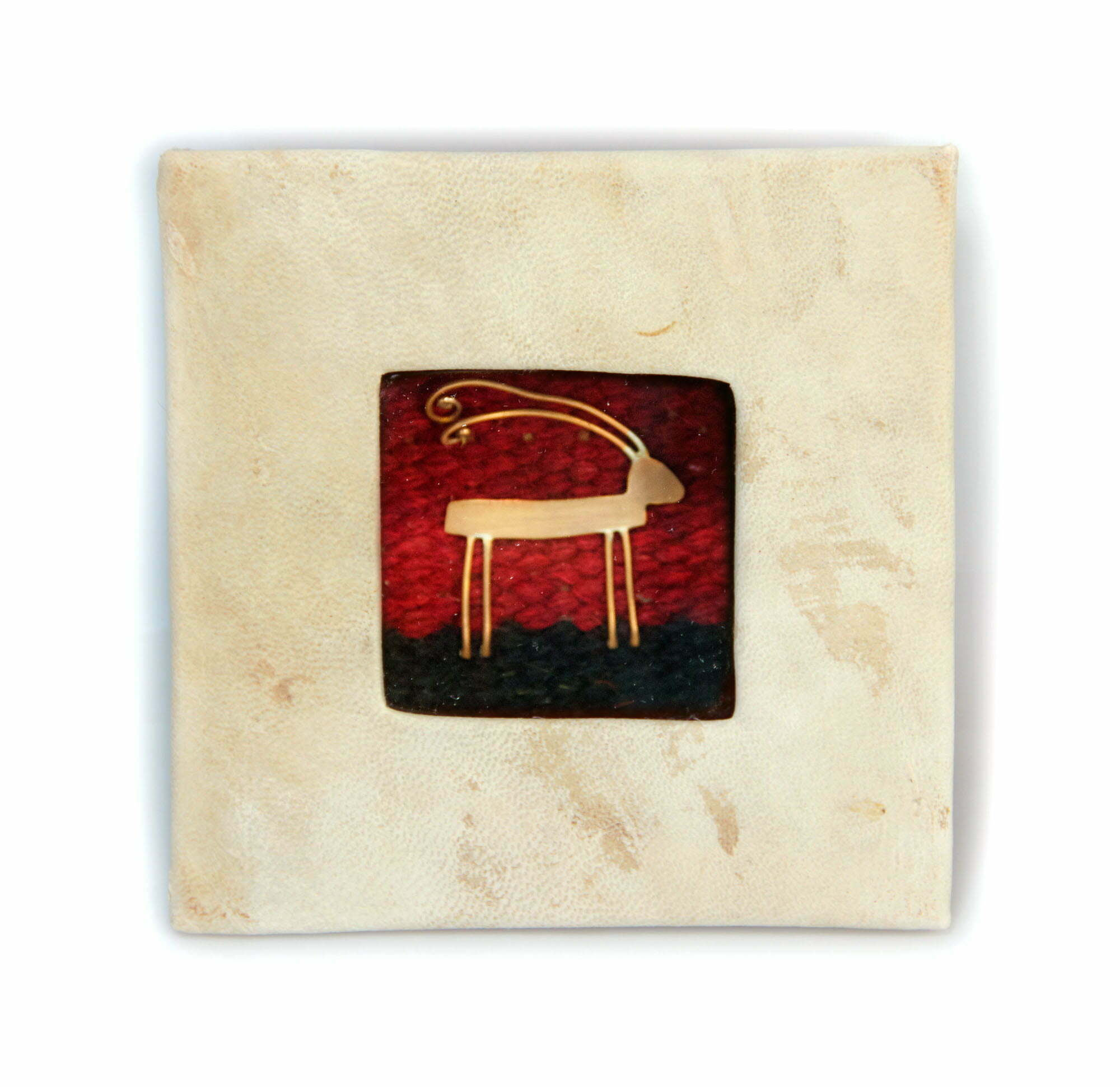 The box is crafted from naturally cured goat skin, and is inlaid with a hand made rug and 1 copper Ibex figure. Hand made by the bedouin women of Feynan Nature Reserve in Dana (south of Jordan). These naturally cured goatskin products not only make great home accessories, they also help the livelihood of bedouins living in gateway communities entrusted with the sustenance of the nature reserve. The hand made rugs will vary in pattern and color as each piece is unique. Minor variations in the shape of the copper figures are also expected as each is uniquely crafted.