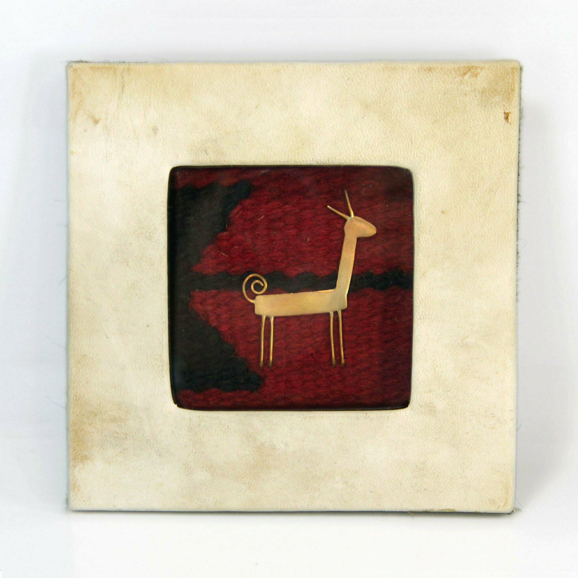 The box is crafted from naturally cured goat skin, and is inlaid with a hand made rug and one copper deer figure. Hand made by the bedouin women of Feynan Nature Reserve in Dana (south of Jordan). These naturally cured goatskin products not only make great home accessories, they also help the livelihood of bedouins living in gateway communities entrusted with the sustenance of the nature reserve. The hand made rugs will vary in pattern and color as each piece is unique. Minor variations in the shape of the copper figures are also expected as each is uniquely crafted.