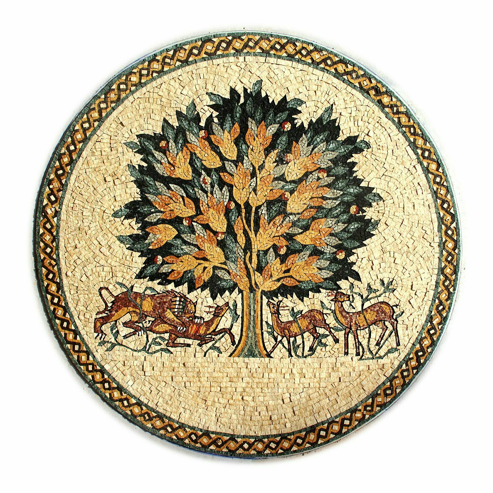 Most iconic “Tree of Life” mosaic in Jordan, which appears in ancient Byzantine art in Jericho in the Holy Land. Diameter 3′-4″ (100cm) Hand made in Madaba, the capital of mosaics in the Middle East, from natural stone pieces. Assembled meticulously in the hundreds of years old tradition of mosaic making, handed down from its golden Byzantine era. Made to order. Delivery time 4-5 weeks.