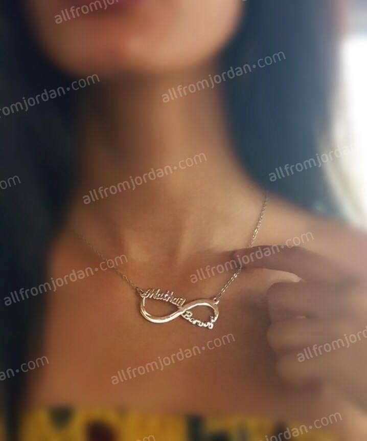 Perfect gift for her. “Infinite Love” necklace with 2 custom made names in Arabic or English. Please specify the two names you wish to have written. Allow 10-14 days to produce and ship. Comes in gold plated or silver plated (rhodium plated). Handmade in Jordan. Free shipping worldwide.