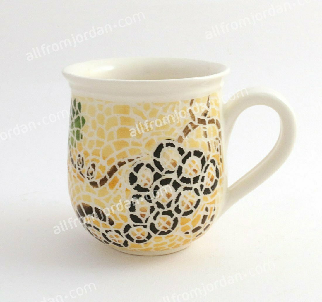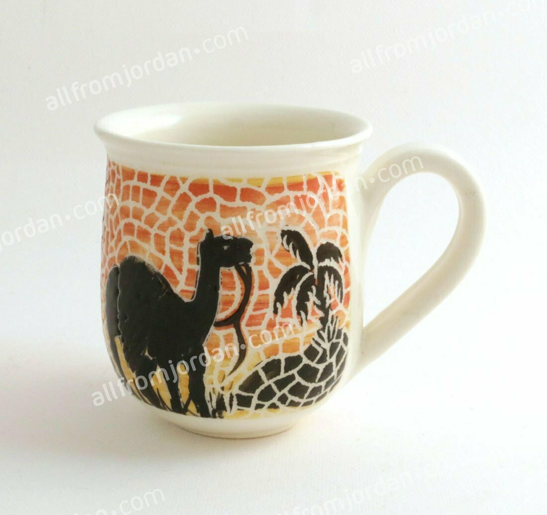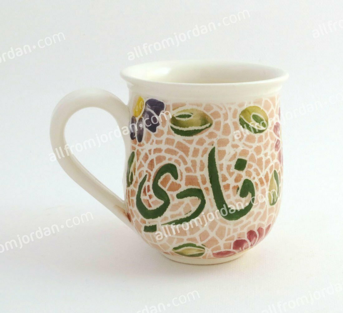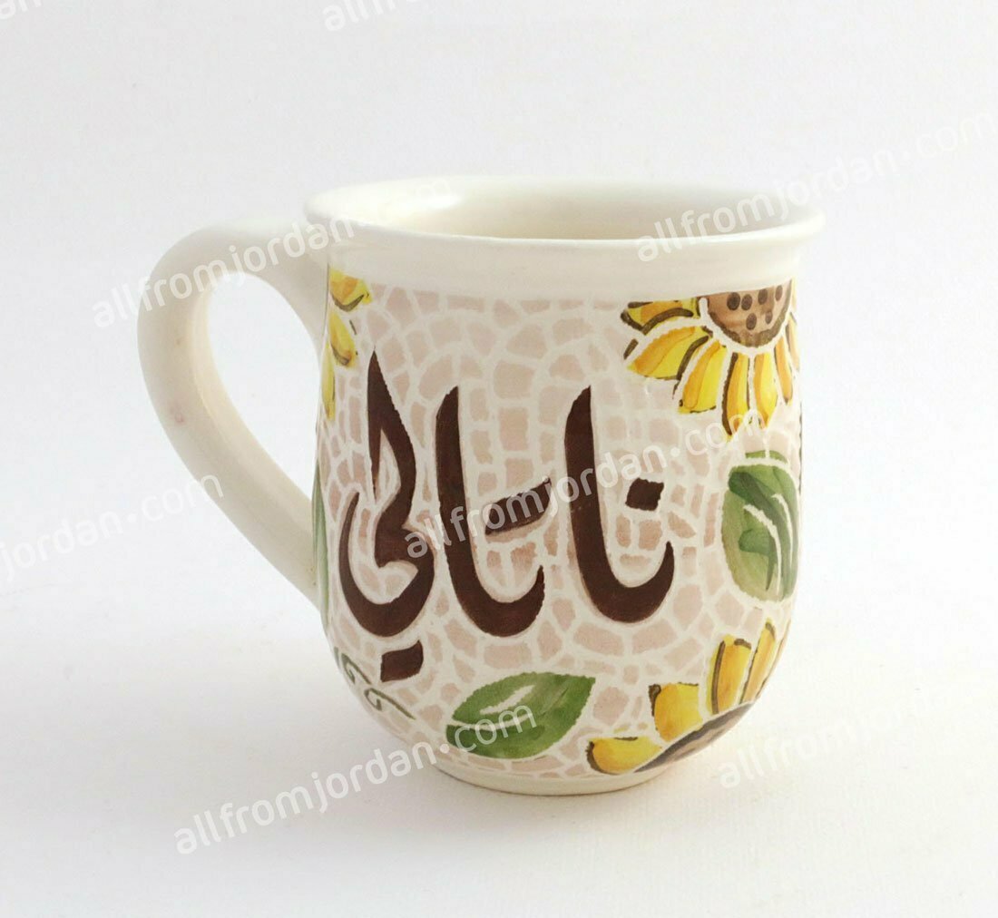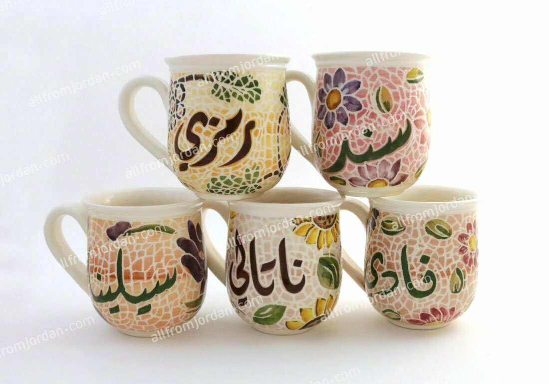 Write your name on a Jordanian mug! Handmade and hand painted with a variety of themes. Available in either white or red clay base.  You can have your name written in Arabic or in Latin lettering. English names can be written in either Arabic or English (latin) letters as per your preference. Arabic names will be written in Arabic unless text field is written in English. Spelling will be exactly as submitted.