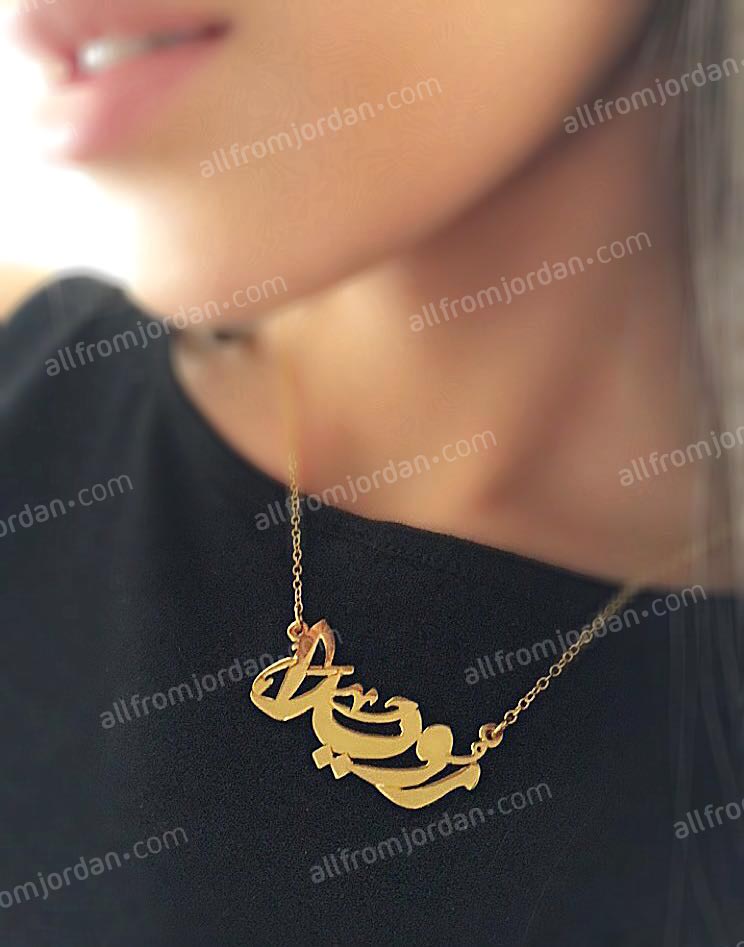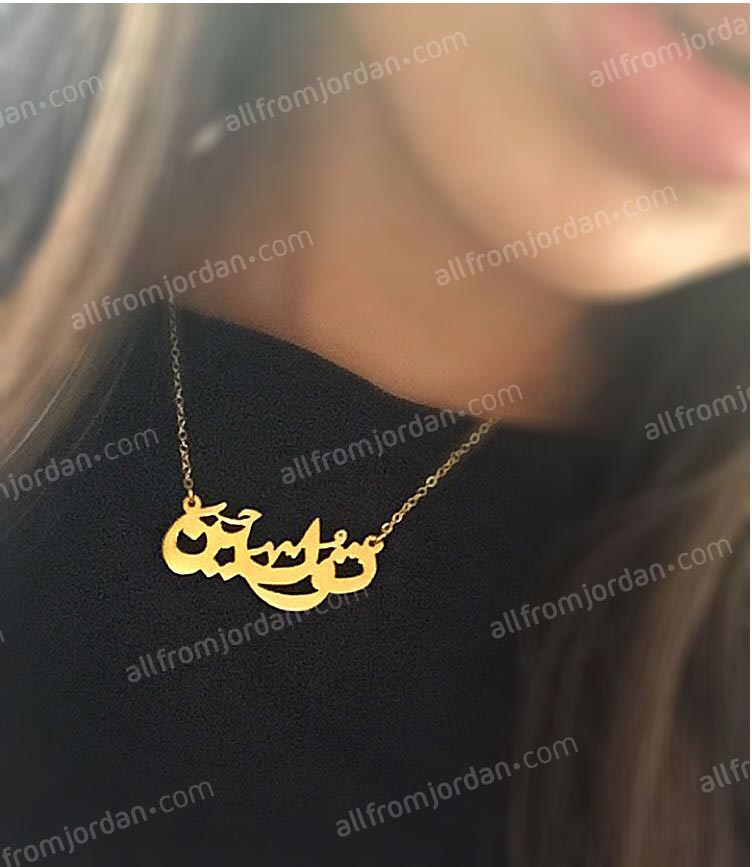 Gold or silver plated necklace with custom made name in Arabic or English. Please specify the name you wish to have written and language. Allow 10-14 days to produce and ship. Comes in gold plated or silver plated (rhodium plated). Handmade in Jordan. For product care avoid contact with perfumes or abrasive liquids. Free shipping worldwide.